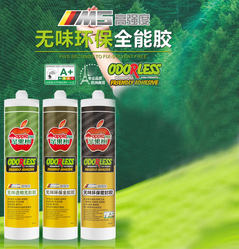 蘋果樹公司,座落于中國最具經濟活力的建材之鄉廣東順德。公司主要從事全效免釘膠、透明免釘膠、戶外免釘膠、液體釘、美縫劑、防霉膠、瓷磚粘結劑、瓷磚背膠、硅酮結構膠、密封膠、MS膠、智能特種膠、集成墻板專用膠、廣告字快速安裝膠、高分子液體卷材防水等高強度建筑結構膠的研發、生產和銷售。產量與市場占有率均居行業前列。